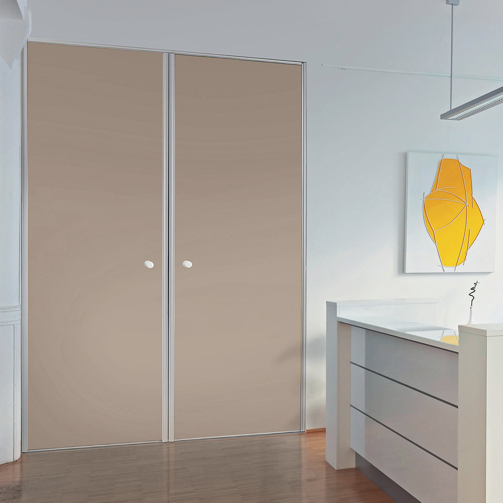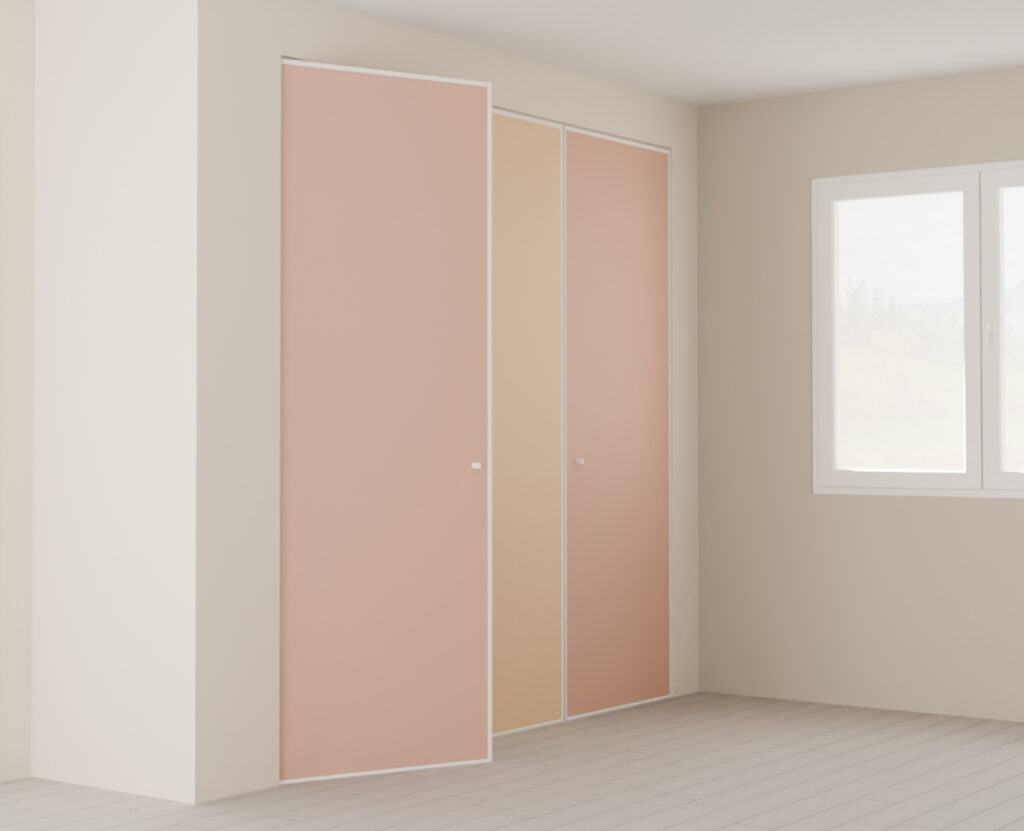 Ces portes de placard sont montées sur pivot et s’ouvrent entièrement sur l’extérieur. Elles s’intègrent sur des rails hauts et bas, comme les portes coulissantes. Une fois la structure de base installée, les pivots intégrés sur les portes viennent se coincer dans le système pré-monté.