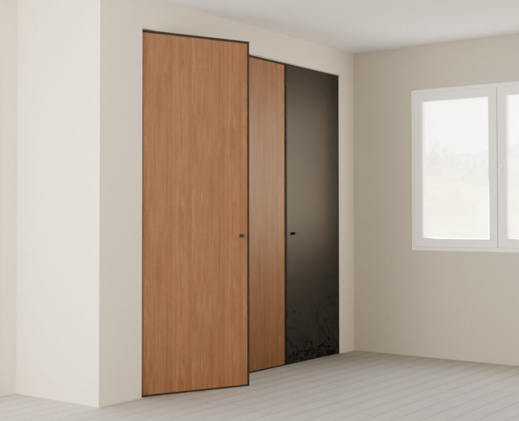 L’ensemble des éléments qui composent la structure des portes pivotantes (portes, rails, cache-rail) va être décliné dans la même matière.