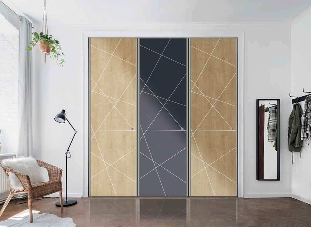 Porte de placard : 3 vantaux, décors noyer lincoln et noir, profil noir mat