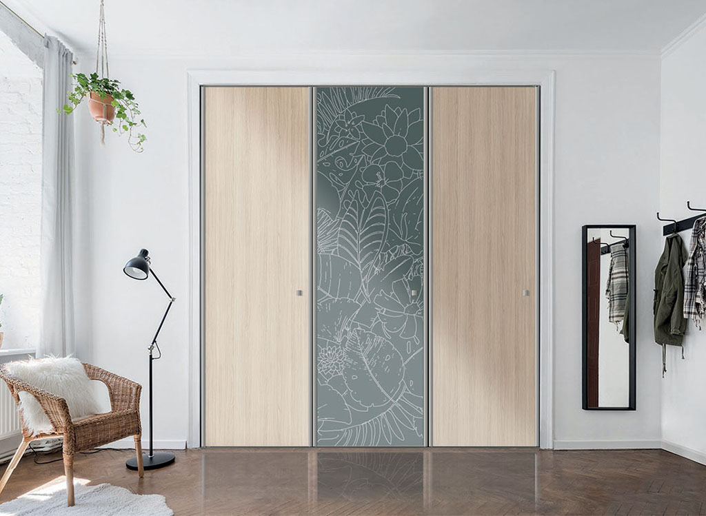 En demandant l’option panneau sérigraphié, donnez plus de caractère à votre porte de placard pivotante. Nos 4 designs inspirés de la nature viennent souligner la présence de votre rangement avec délicatesse.