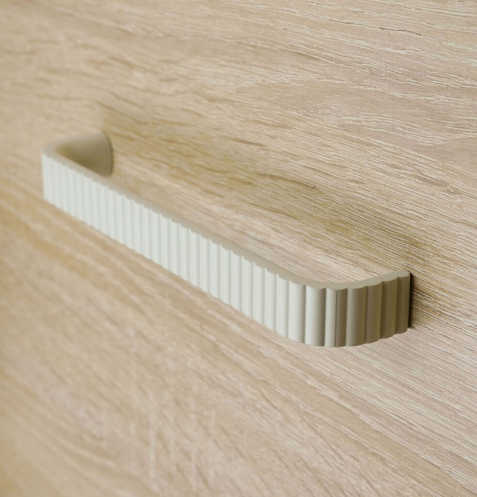 Positionnée sur le chant du panneau, cette poignée offre des courbes délicates. Ses 4 longueurs permettent des esthétiques radicalement différentes. En version courte, elle se fait subtile, tandis qu’en version longue, elle souligne la porte.