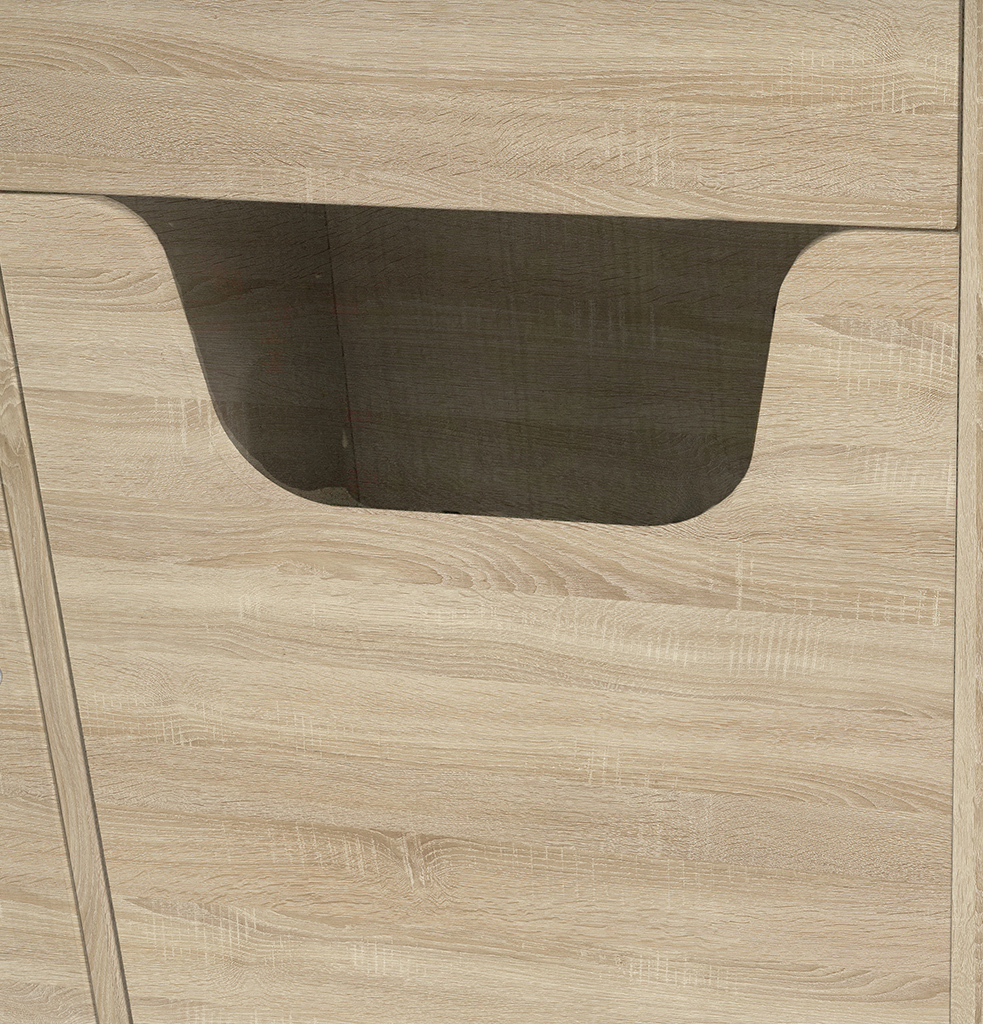 Idéale pour une salle de bain ou une buanderie, cette découpe permet de glisser facilement le linge sale dans un panier, qui reste dissimulé derrière une façade.